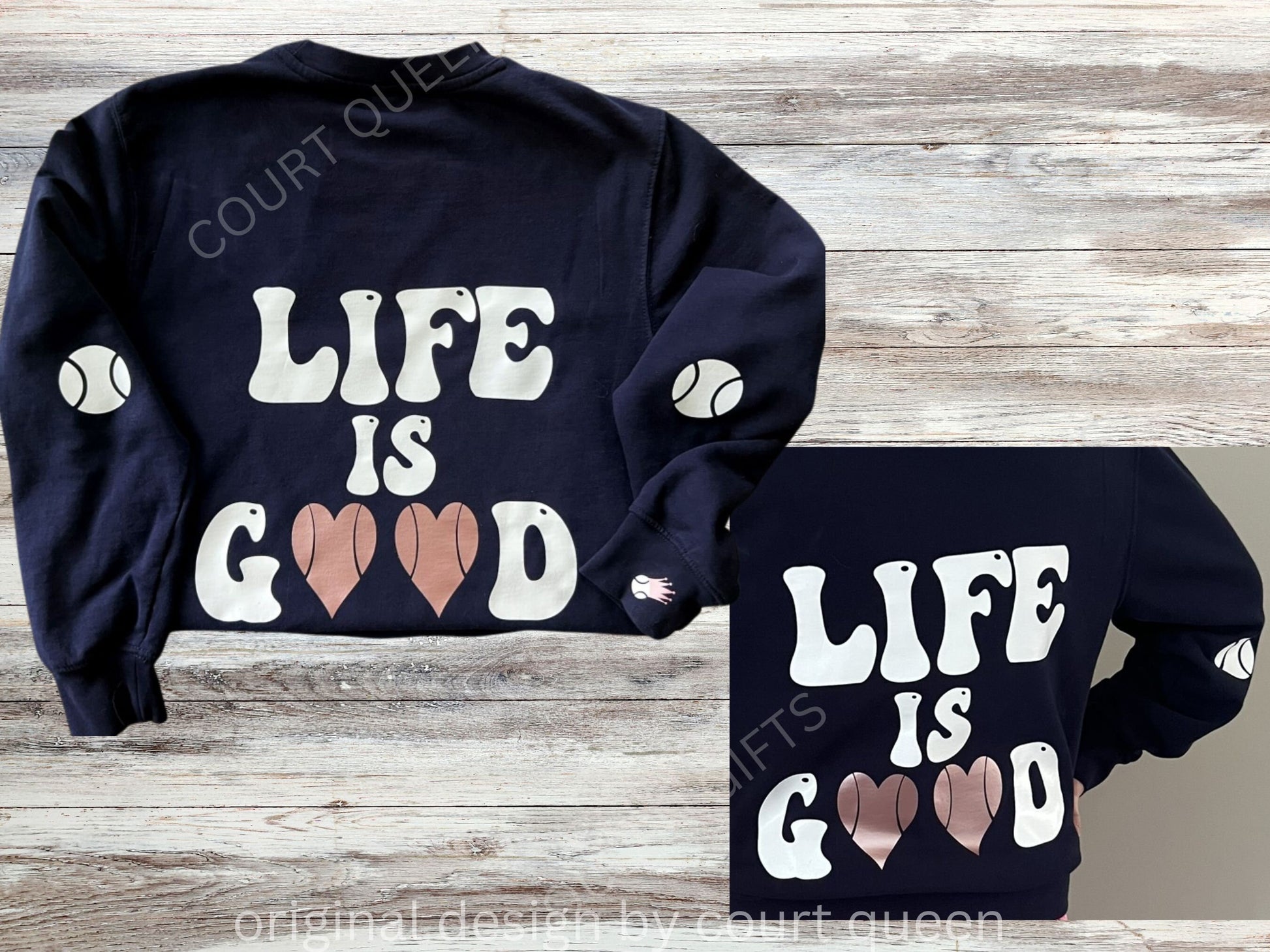 This Bella Crew LIFE IS GOOD (HEARTS) design includes a tennis ball monogram on the front, our original LIFE IS GOOD design on the back, and our signature elbow balls and the Court Queen ball & crown logo on the cuff.