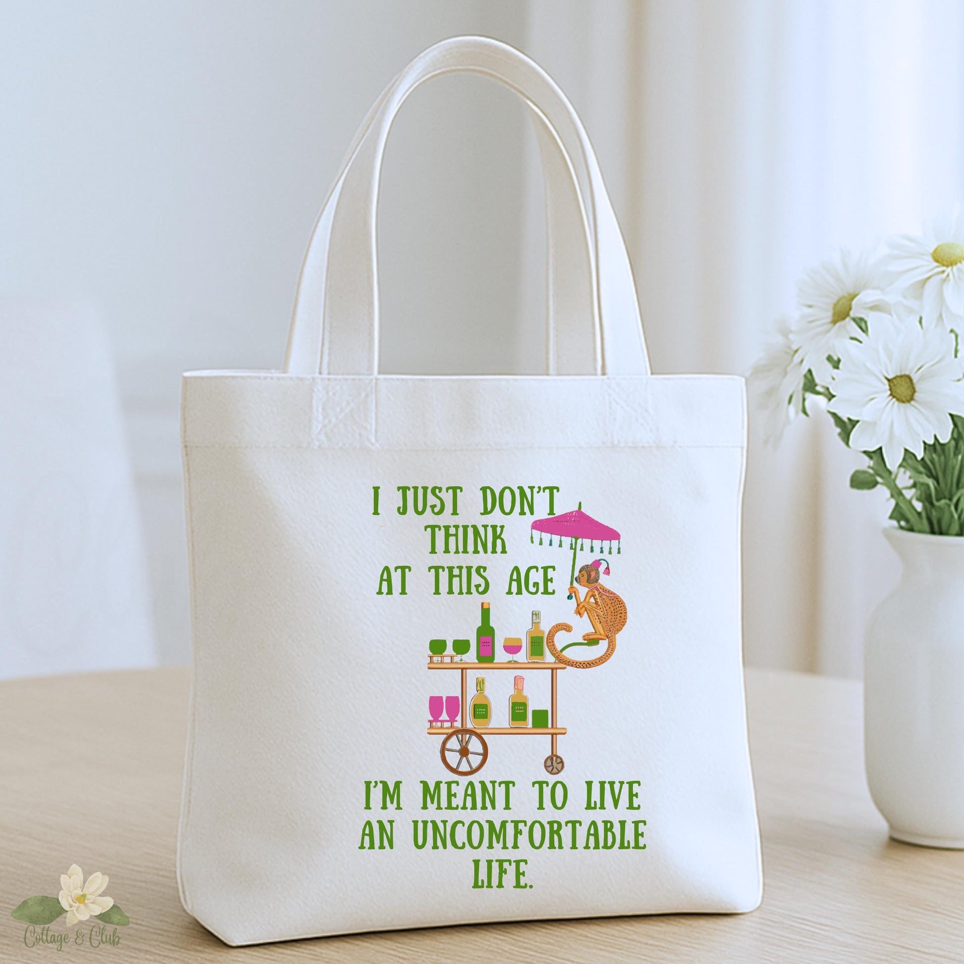 One tote features a pink elephant being absolutely done with the day (hello, Piper moment). The other “At this age, I’m meant to live an uncomfortable life.”