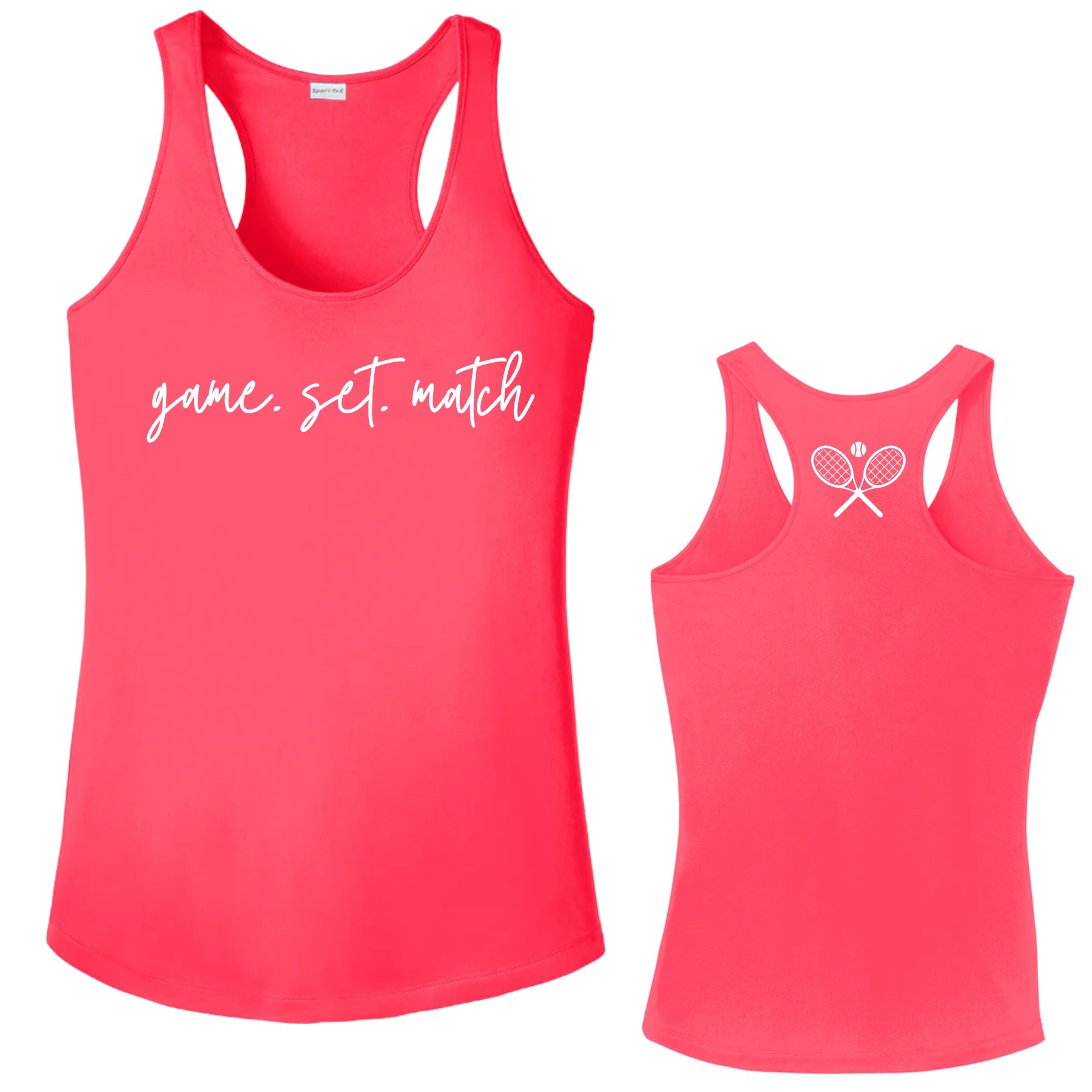 Ace your style with our Game. Set. Match. tennis racerback tank! This vibrant and lightweight tank is perfect for tennis lovers who want to look and feel great on the court. With its bold front design and crossed tennis racket detail on the back, this tank brings a winning combination of comfort and style.