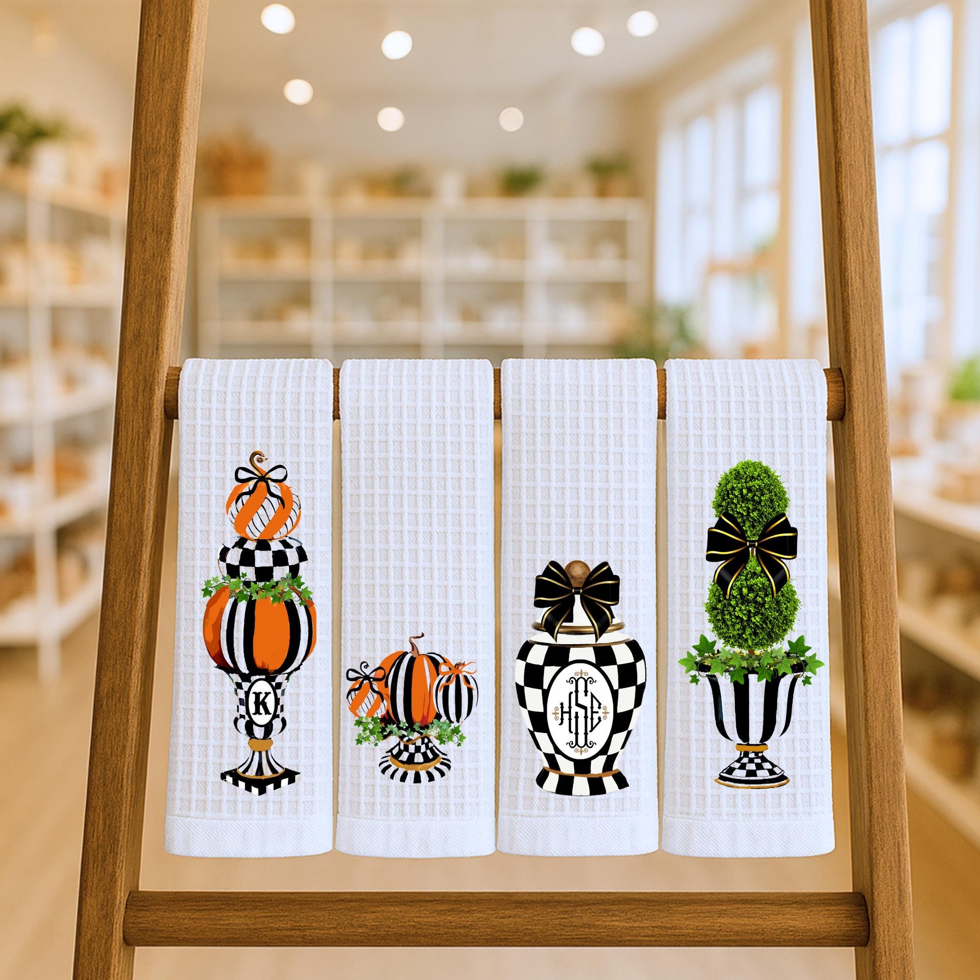 Using the latest Direct-to-Garment (DTG) printing technology, each towel features bright, crisp designs that will stay vibrant over time—no cracking or peeling like vinyl or heat transfer methods. The timeless Courtly Check pattern in classic black and white is beautifully complemented with festive pumpkin accents, making it an ideal addition for Halloween, fall decor, or year-round prep.