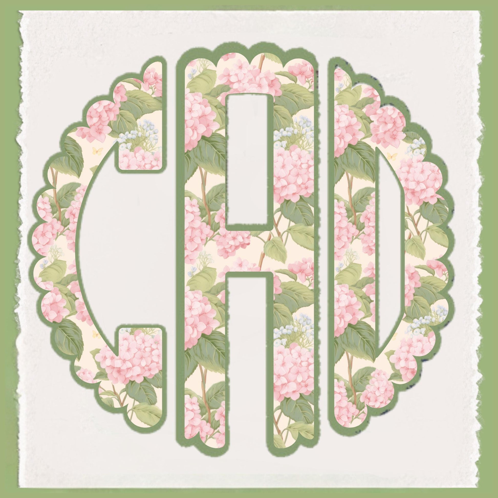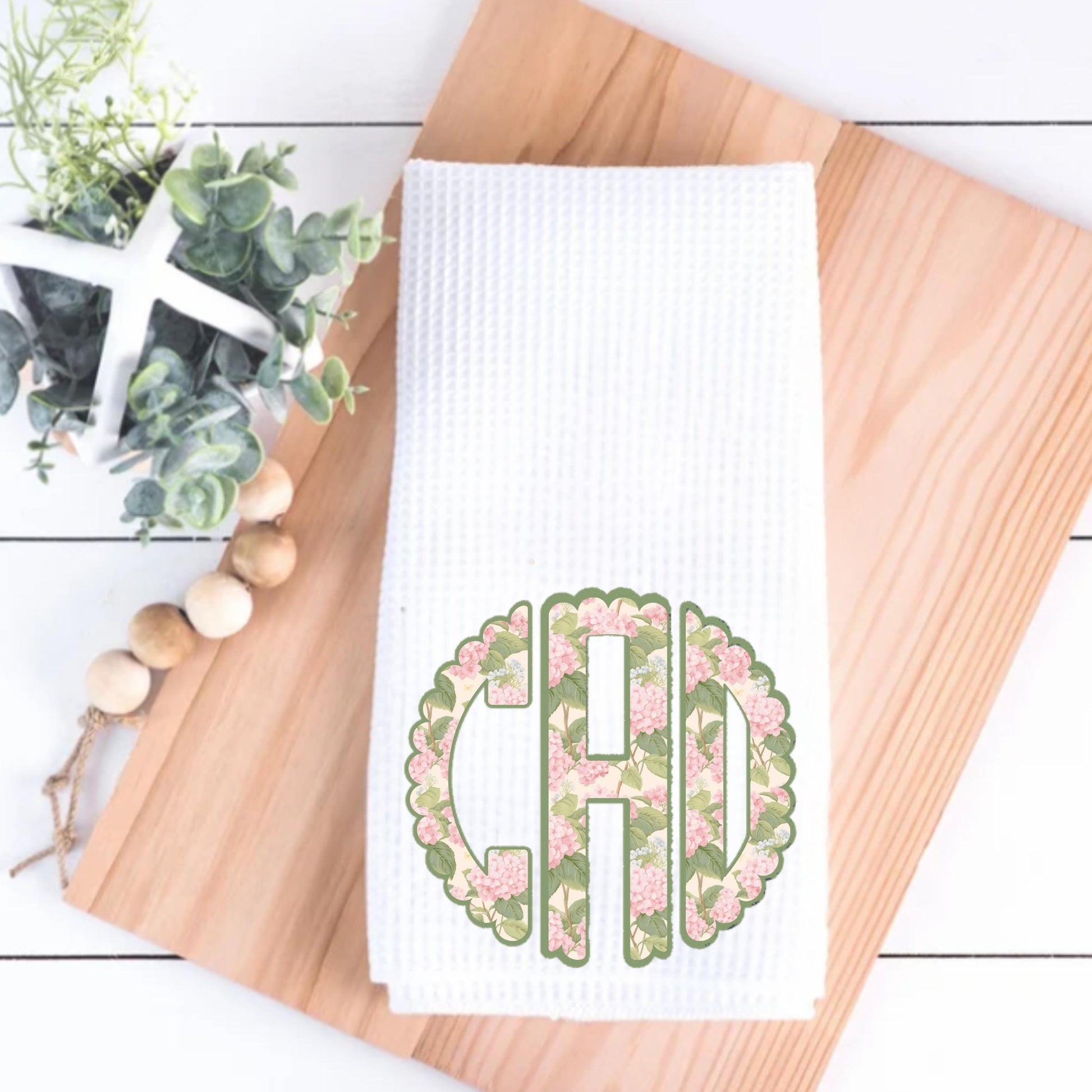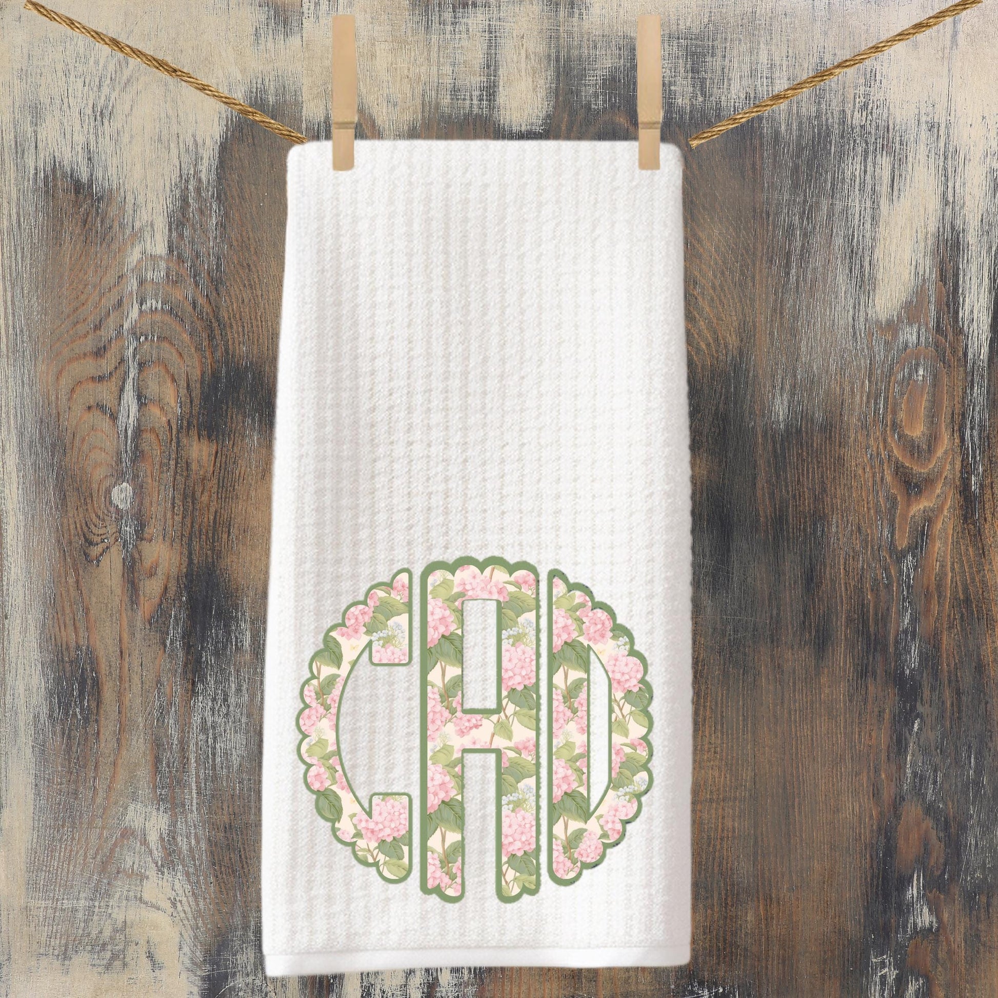 Celebrate preppy elegance with this Pink and Green Hydrangea Design Circle applique-themed monogram Tea Towel. This is a direct-to-garment print, not a thread-embroidered applique. This design will not fade or pull and can be laundered and used daily or displayed. Made from soft, absorbent waffle weave fabric, these tea towels are both decorative and functional, making them perfect for drying dishes, styling a chinoiserie-inspired kitchen, or gifting to a monogram or bunny lover.