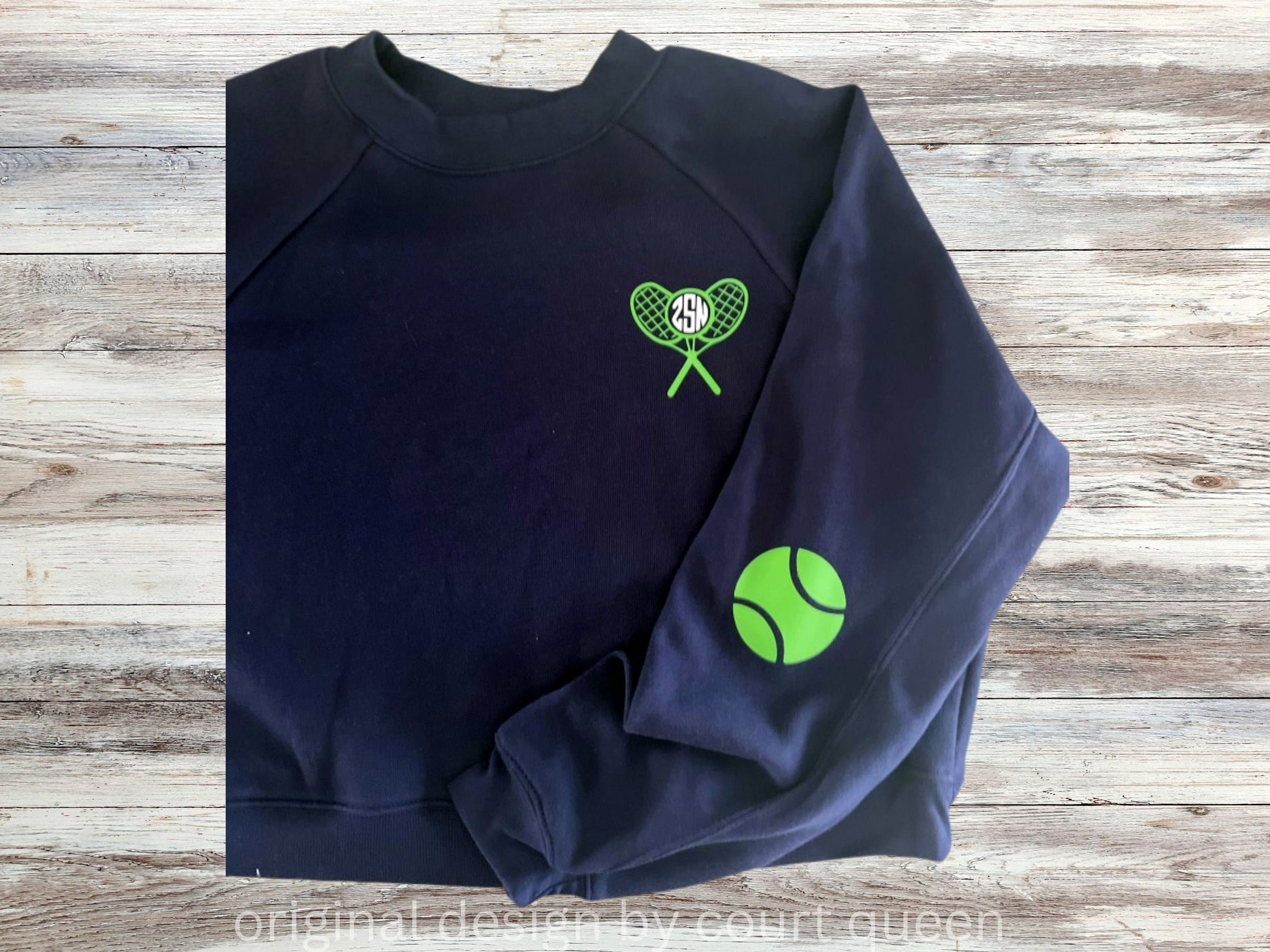 This Bella Crew Cross Court Monogram design includes our two racket monogram on the front, along with our signature elbow balls and the Court Queen ball & crown logo on the cuff.