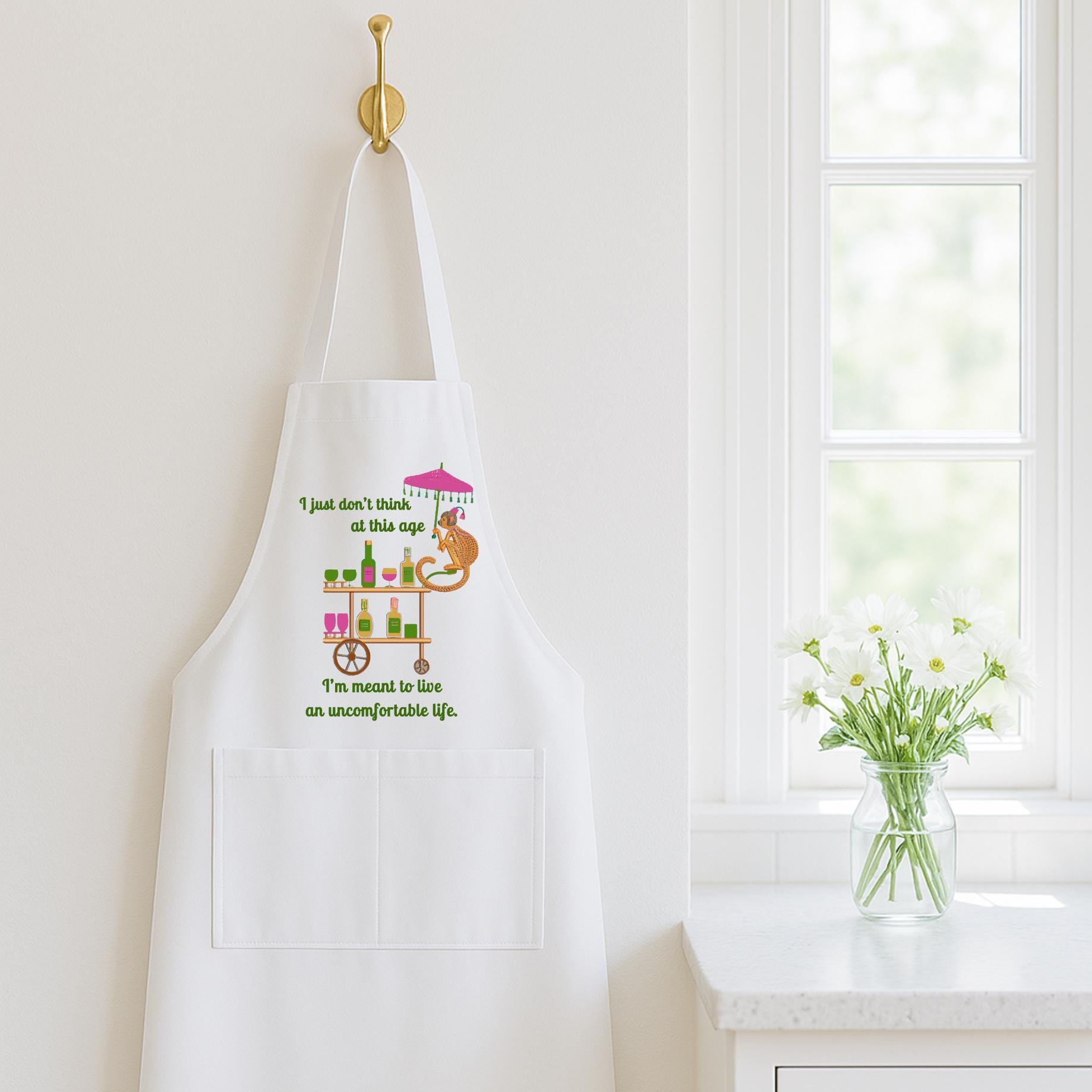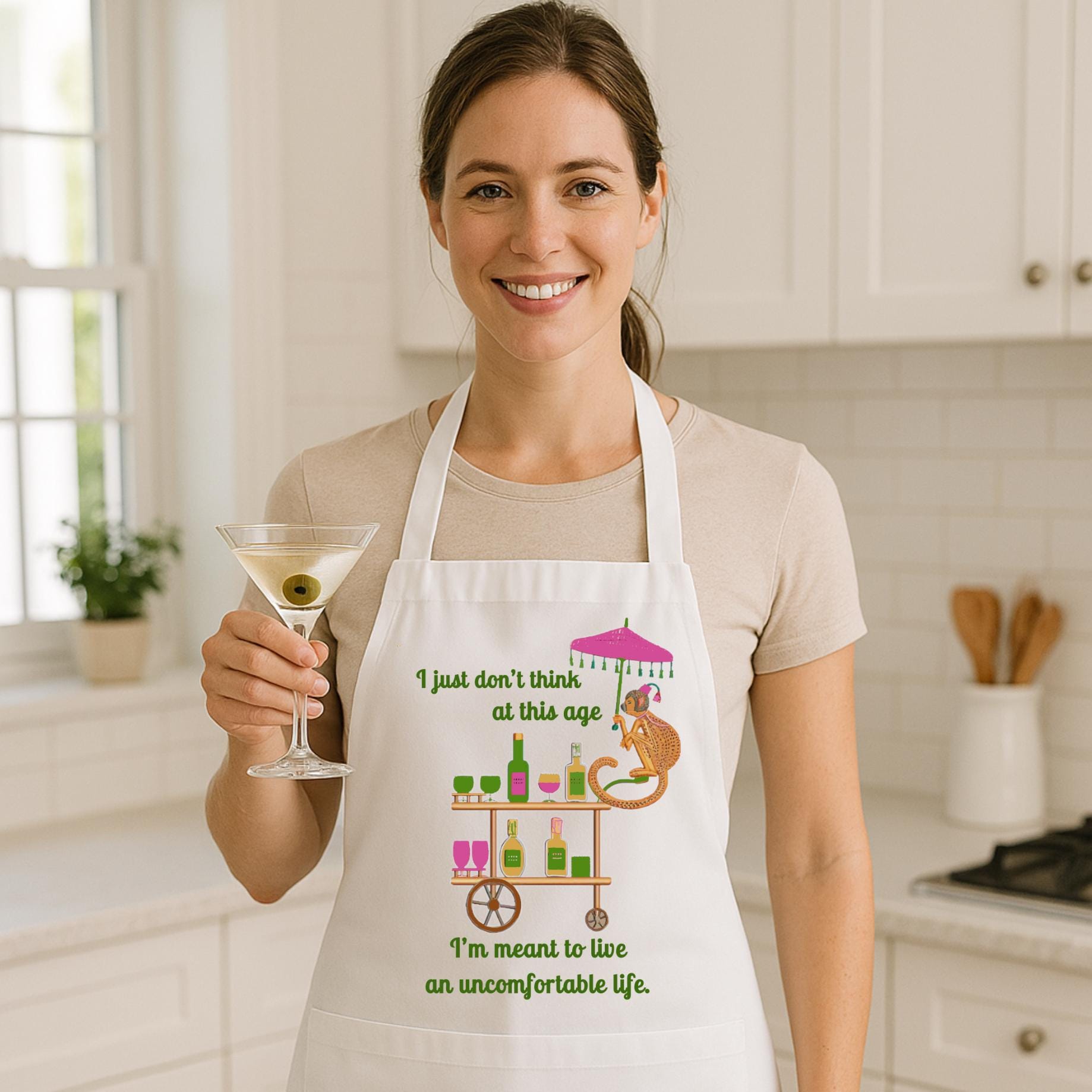 Whether you‘re hosting brunch, mixing cocktails, or just pretending to stir something while sipping your wine, these aprons bring the humor and the style. Featuring our cheeky monkey under a cocktail umbrella and a bar cart full of colorful bottles, these designs are a whole vibe.