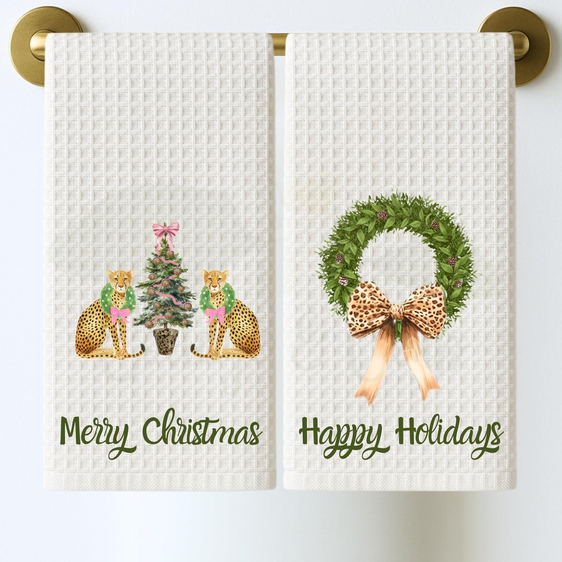 This collection combines playful cheetah motifs with preppy pink and green accents, making it a versatile and stylish addition to any holiday or everyday kitchen decor. Whether you‘re giving as a gift for her, mom, or a hostess, or just adding a cheerful touch to your own space, these towels are sure to bring smiles and festive spirit. Celebrate the season in style with our charming Christmas Cheetah Tea Towel Collection!