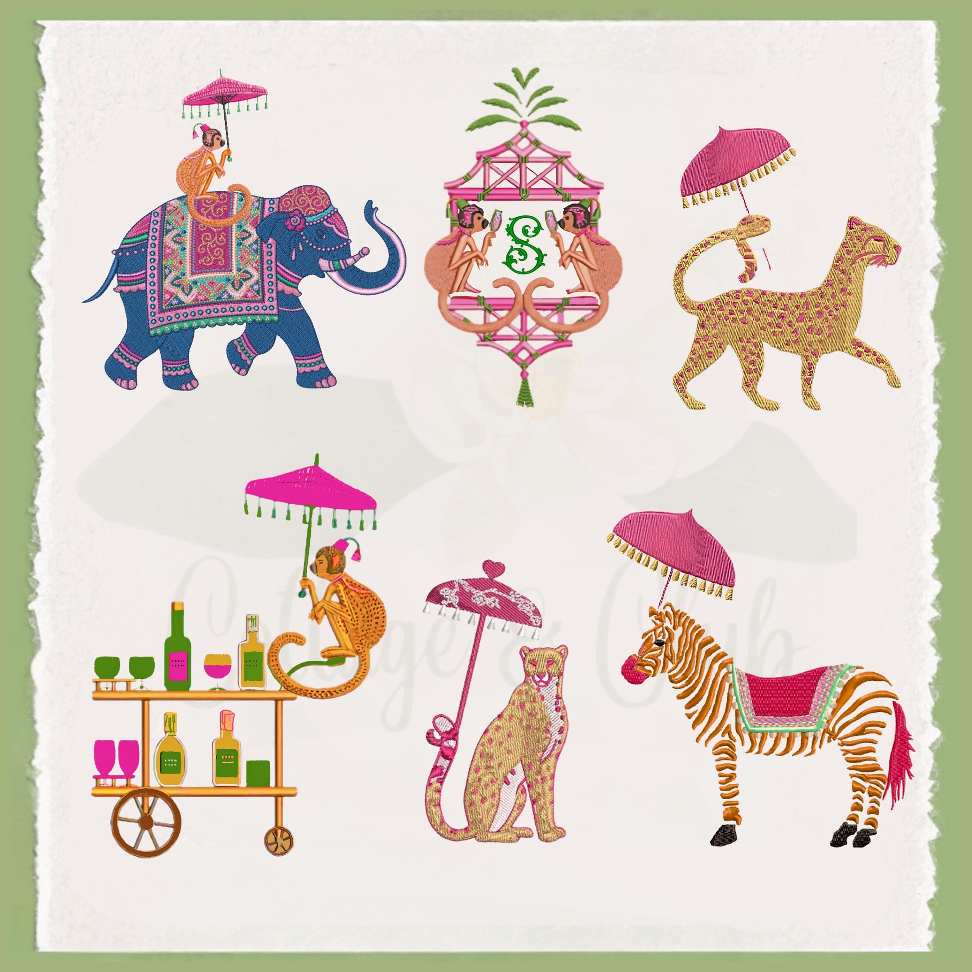 Step into the fun side of the tropics with our Palm Beach Animal Party Tea Towels! This precisously preppy 4-piece collection features bright, bold designs including a pink elephant, cheeky monkeys, a leopard with a parasol, and a fabulous bar cart—all full of playful color and palm beach preppy flair.